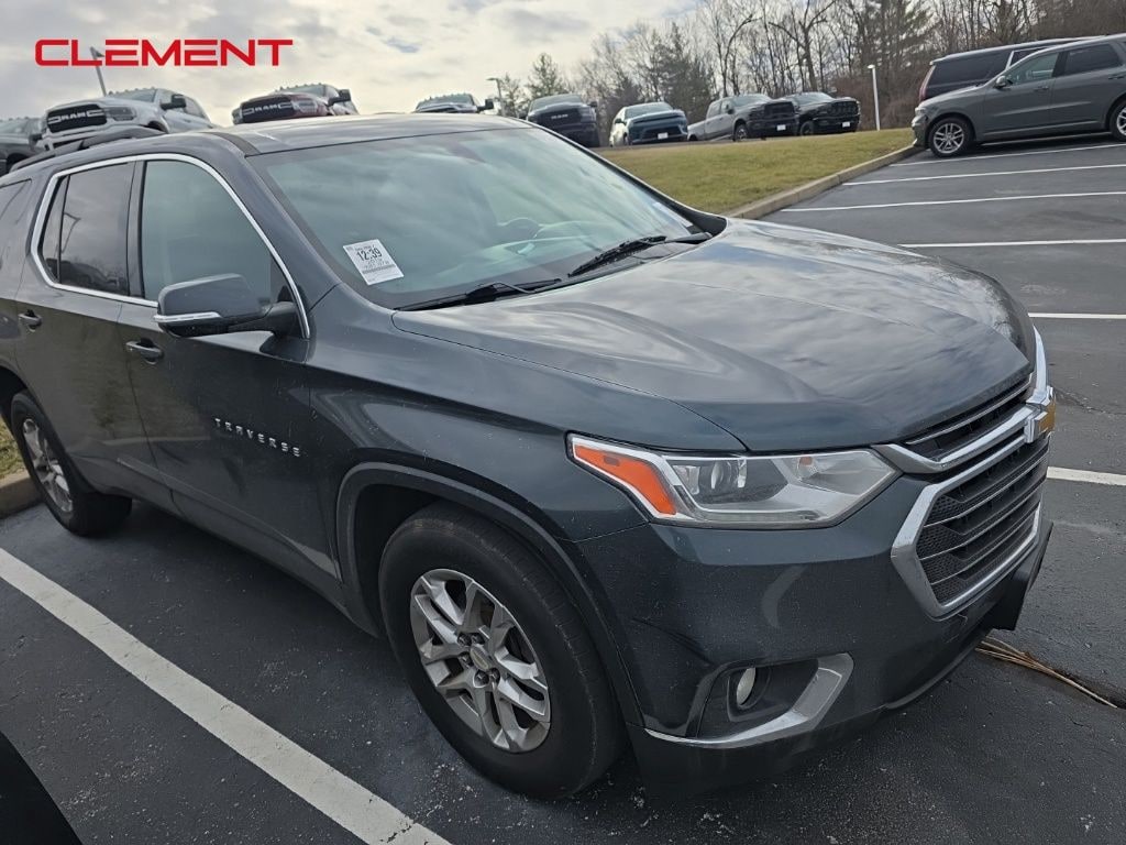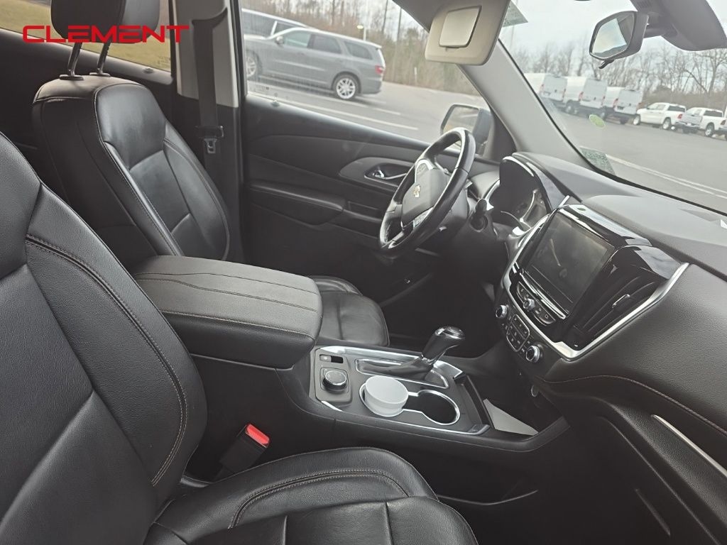 This Traverse is well equipped with Front License Plate Bracket Mounting Package, Preferred Equipment Group 3LT, Clement Assurance Certified, AWD, 3.49 Axle Ratio, 3rd row seats: split-bench, 4-Wheel Disc Brakes, 6 Speakers, 7-Passenger Seating (2-2-3 Seating Configuration), ABS brakes, Air Conditioning, Alloy wheels, AM/FM radio: SiriusXM, Apple CarPlay/Android Auto, Automatic temperature control, Brake assist, Bumpers: body-color, Compass, Delay-off headlights, Driver door bin, Driver vanity mirror, Dual front impact airbags, Dual front side impact airbags, Electronic Stability Control, Emergency communication system, Four wheel independent suspension, Front anti-roll bar, Front Bucket Seats, Front Center Armrest, Front dual zone A/C, Front fog lights, Front reading lights, Fully automatic headlights, Garage door transmitter, Heated door mirrors, Heated front seats, High-Intensity Discharge Headlights, Illuminated entry, Leather-Appointed Seat Trim, Low tire pressure warning, Occupant sensing airbag, Outside temperature display, Overhead airbag, Overhead console, Panic alarm, Passenger door bin, Passenger vanity mirror, Power door mirrors, Power driver seat, Power Liftgate, Power passenger seat, Power steering, Power windows, Premium audio system: Chevrolet MyLink, Radio data system, Radio: Chevrolet Infotainment AM/FM w/8" Screen, Rear air conditioning, Rear anti-roll bar, Rear reading lights, Rear window defroster, Rear window wiper, Remote keyless entry, Roof rack: rails only, Security system, SiriusXM Radio, Speed control, Speed-sensing steering, Spoiler, Steering wheel mounted audio controls, Tachometer, Telescoping steering wheel, Tilt steering wheel, Traction control, Trip computer, Turn signal indicator mirrors, Variably intermittent wipers, Voltmeter, and Wheels: 18" Bright Silver Painted Aluminum.